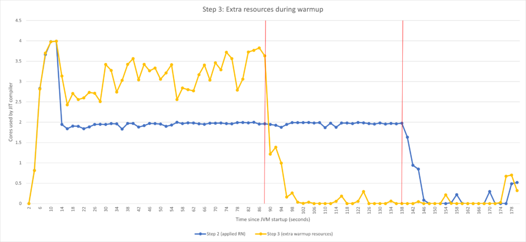 Once the warmup period is over, the compiler’s available CPU is limited by -XX:CompilerTier2BudgetingCPUPercent=33 which turns into much lower CPU utilization after the 60 second mark.