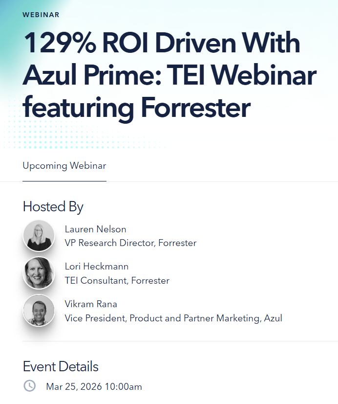 Join Azul on 3/25 for a webinar with Forrester’s VP Research Director, Lauren Nelson, and Lori Heckman, Forrester TEI consultant, where you will learn: